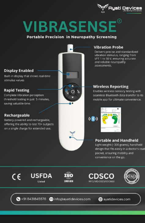 Discover all the details and benefits of Vibrasense in one comprehensive guide. Our product brochure provides in-depth information about the features, functionality, and advantages of our portable neuropathy screening device. Learn how Vibrasense can enhance your clinical practice, improve patient outcomes, and help prevent diabetic complications. Download the brochure now to explore how this innovative tool can make a difference in your healthcare delivery.